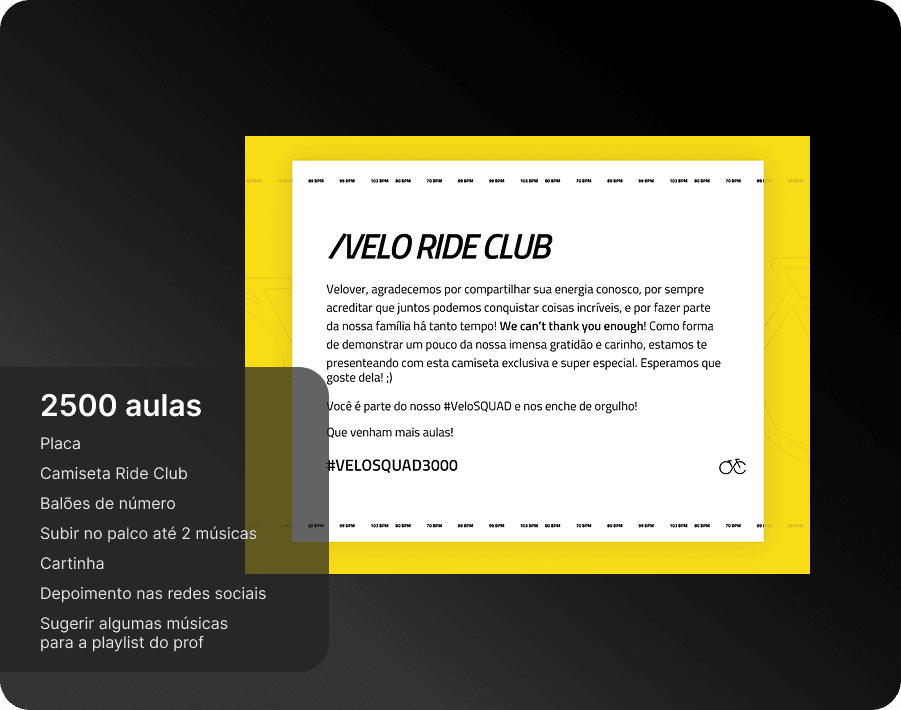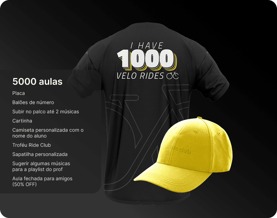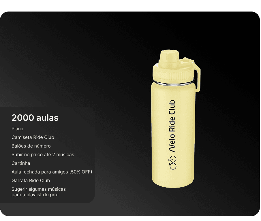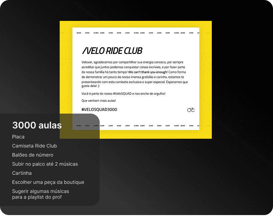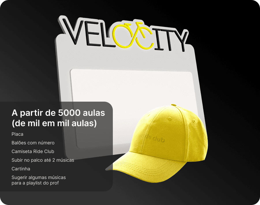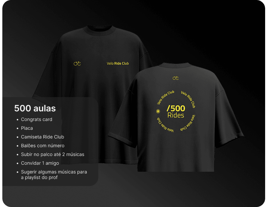Eles são complementares e pensados para momentos diferentes da sua jornada. O Programa de Fidelidade é funcional e de curto prazo: você acumula pontos a cada check-in e troca por recompensas tangíveis, como produtos e aulas bônus. O Velo ride club é de longo prazo: celebramos seus grandes marcos de aulas com itens simbólicos, experiências únicas e reconhecimento público.